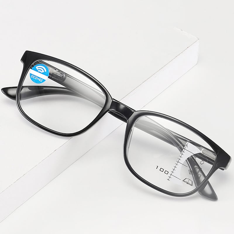 Brýle na čtení Smart Zoom: Mezi ohnisky progresivních čoček není žádná viditelná dělicí čára a světlo vidíte plynule bez přechodů obrazu. Nemusíte si brýle sundávat, stačí pohybovat očima nahoru a dolů, abyste viděli věci daleko i blízko, a také věci v různých vzdálenostech mezi různými optickými oblastmi čoček.